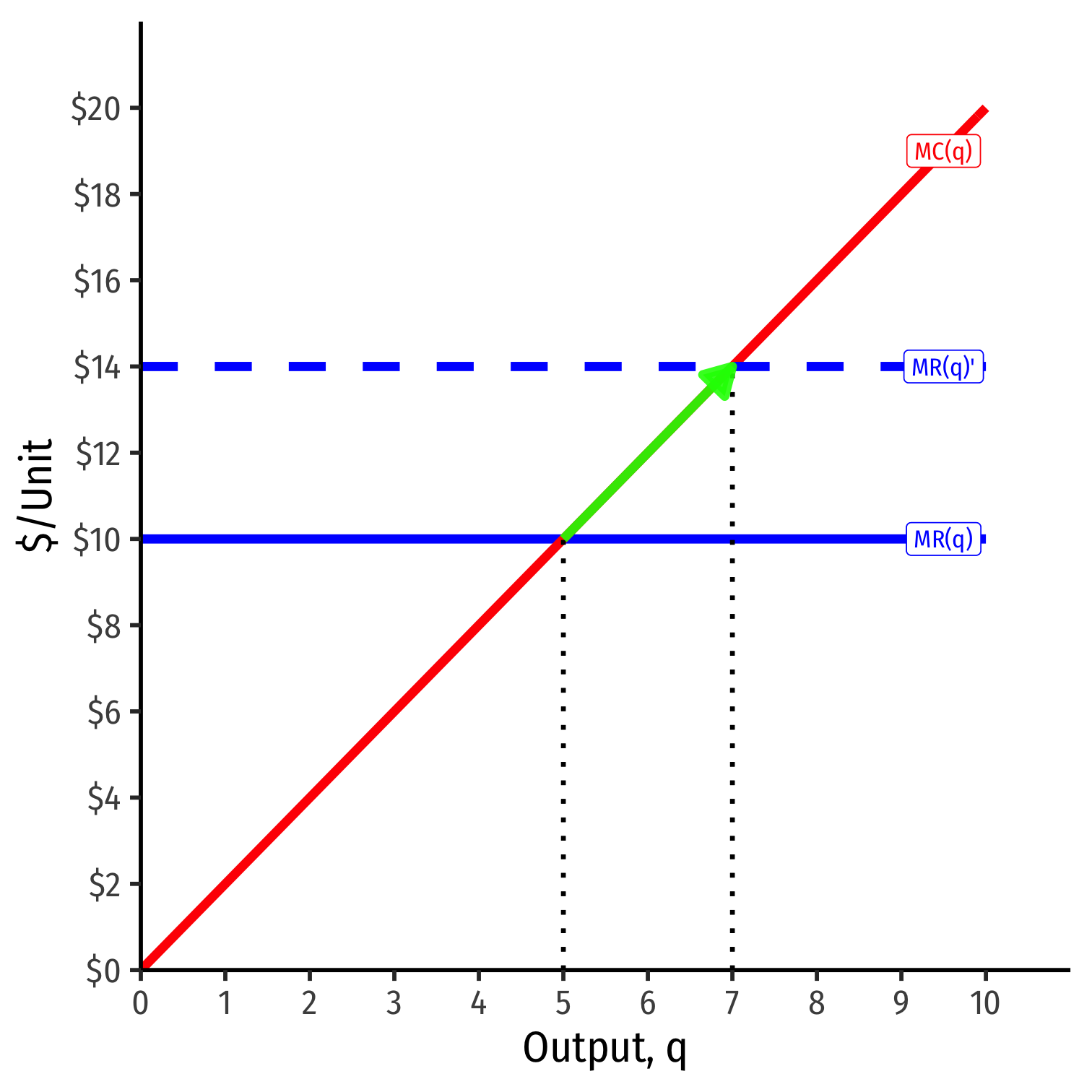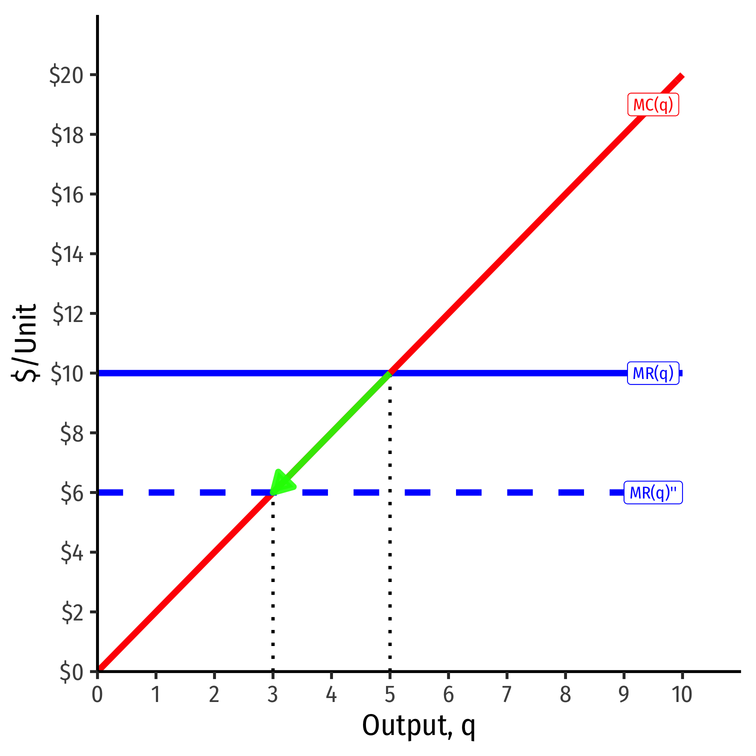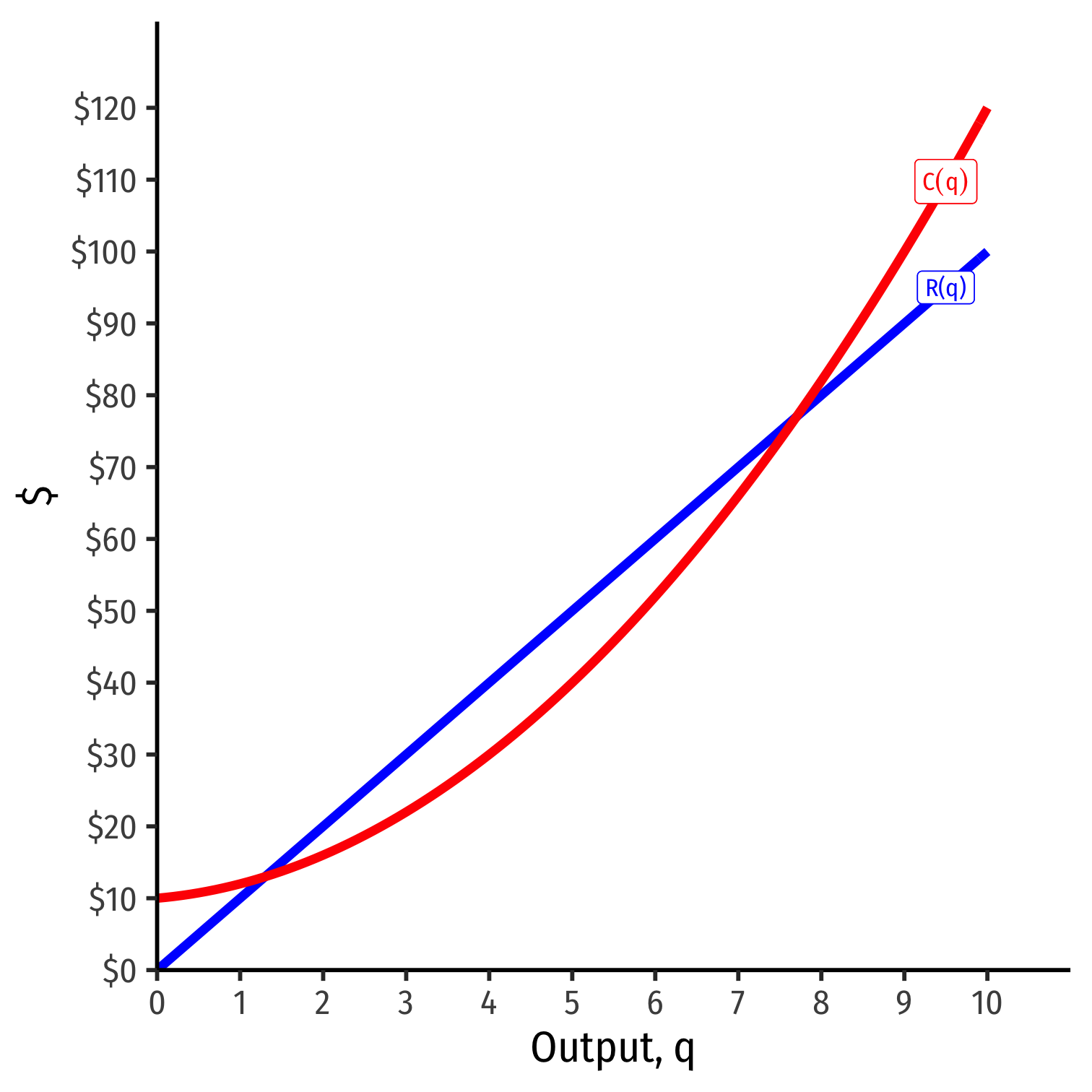 Marginal Revenue: change in revenues for each additional unit of output sold: MR(q)=ΔR(q)Δq≈R2−R1q2−q1