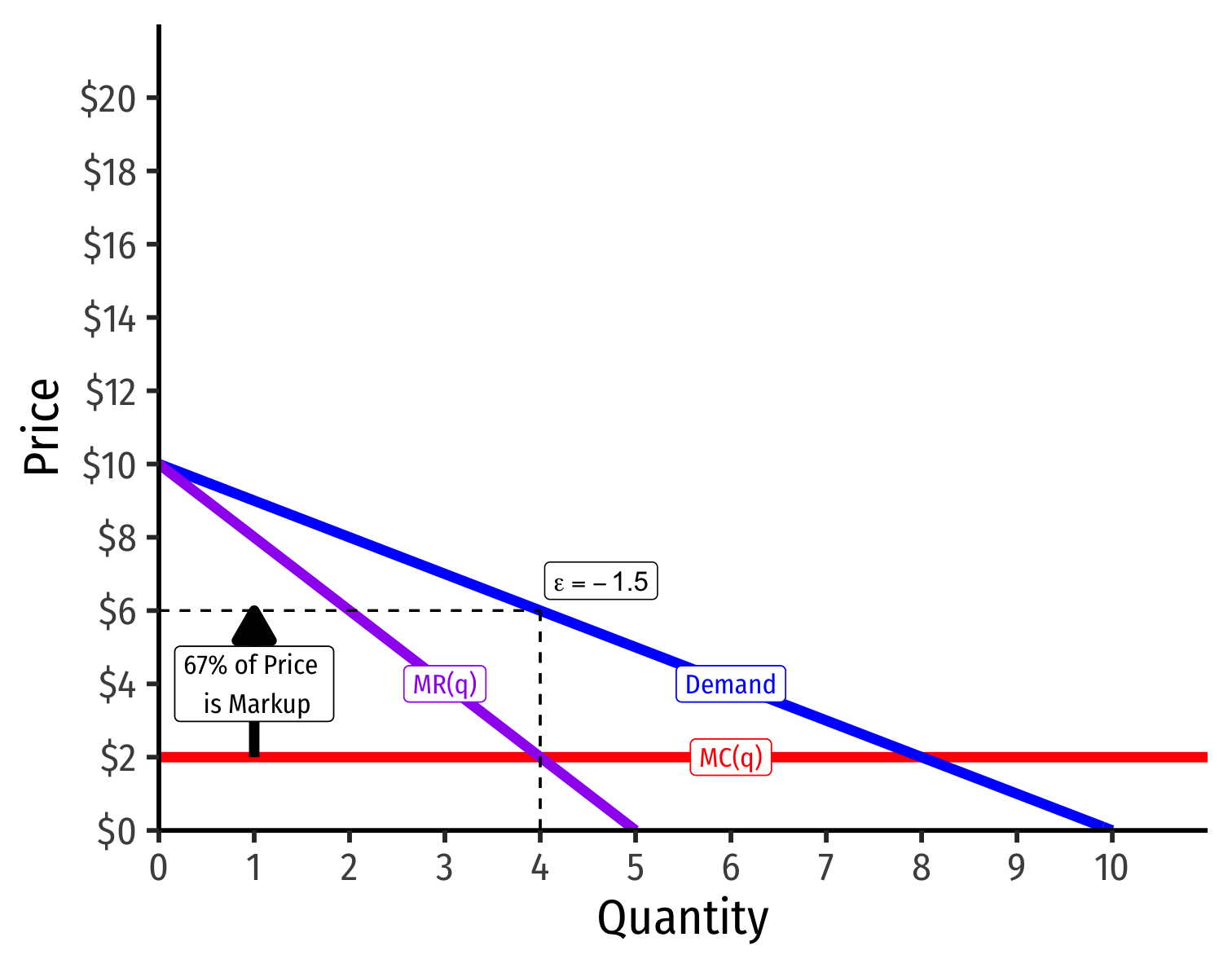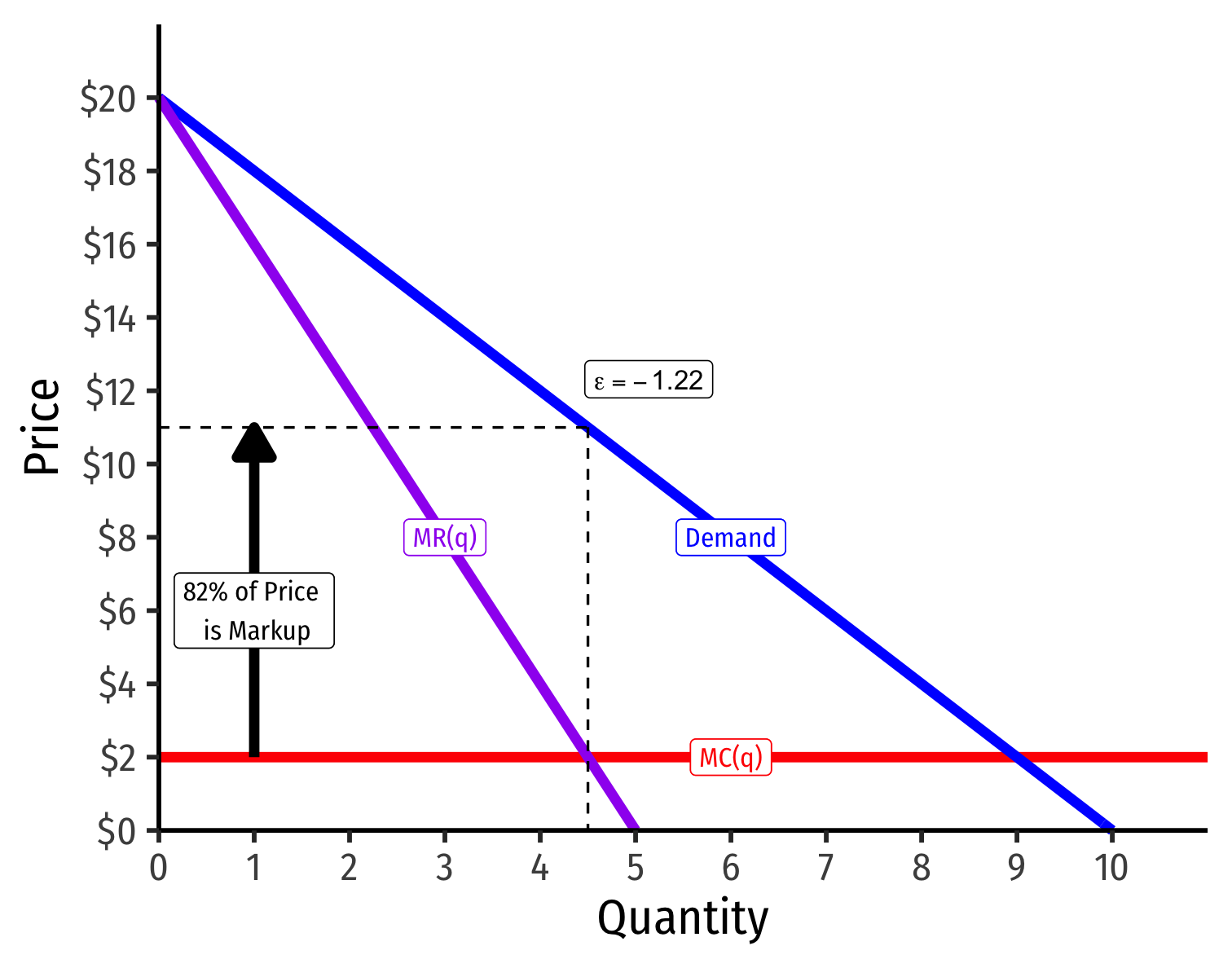The more (less) price elastically a good, the less (more) market power: L=p−MC(q)p=−1ϵ