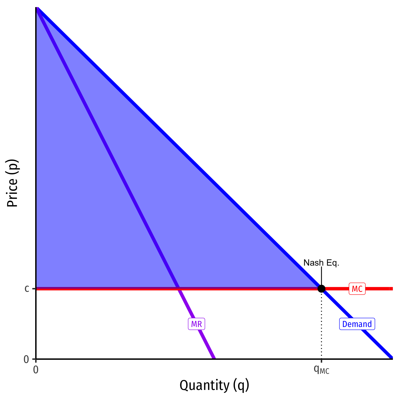 Suppose both firms have identical costs: C(q)=cqMC(q)=c